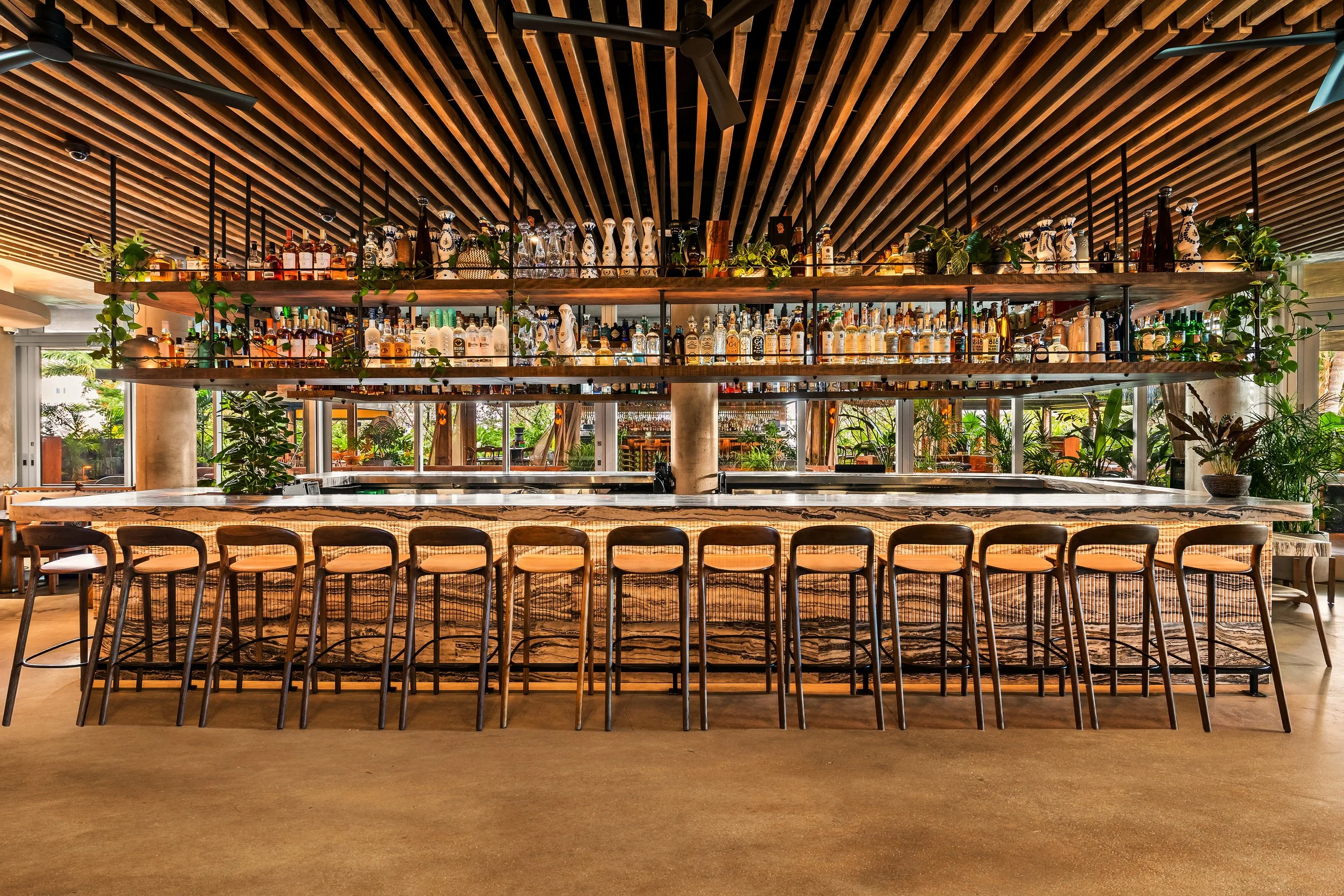 The unique venue draws upon minimalistic natural materials and earthy tones, combined with opulent warm-glow lamps, textured prints and shades, and a dramatic, lush foliage hanging from the ceiling.