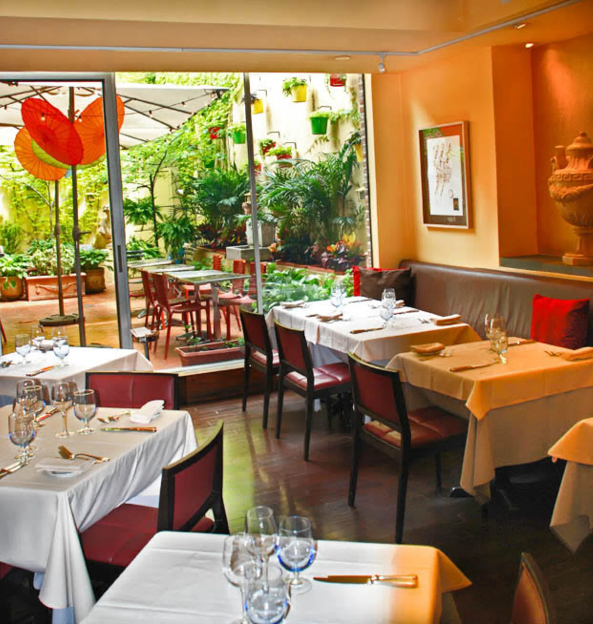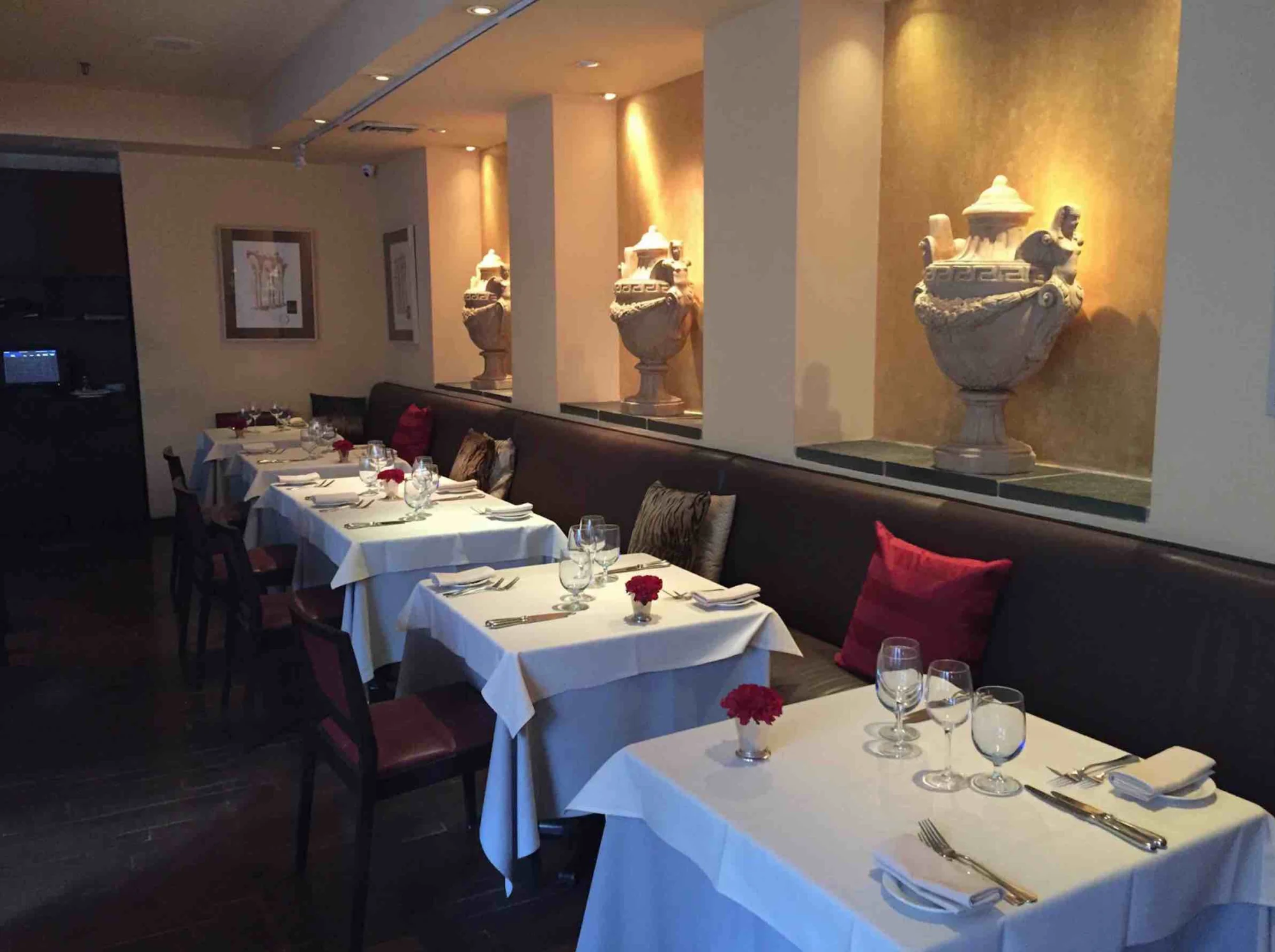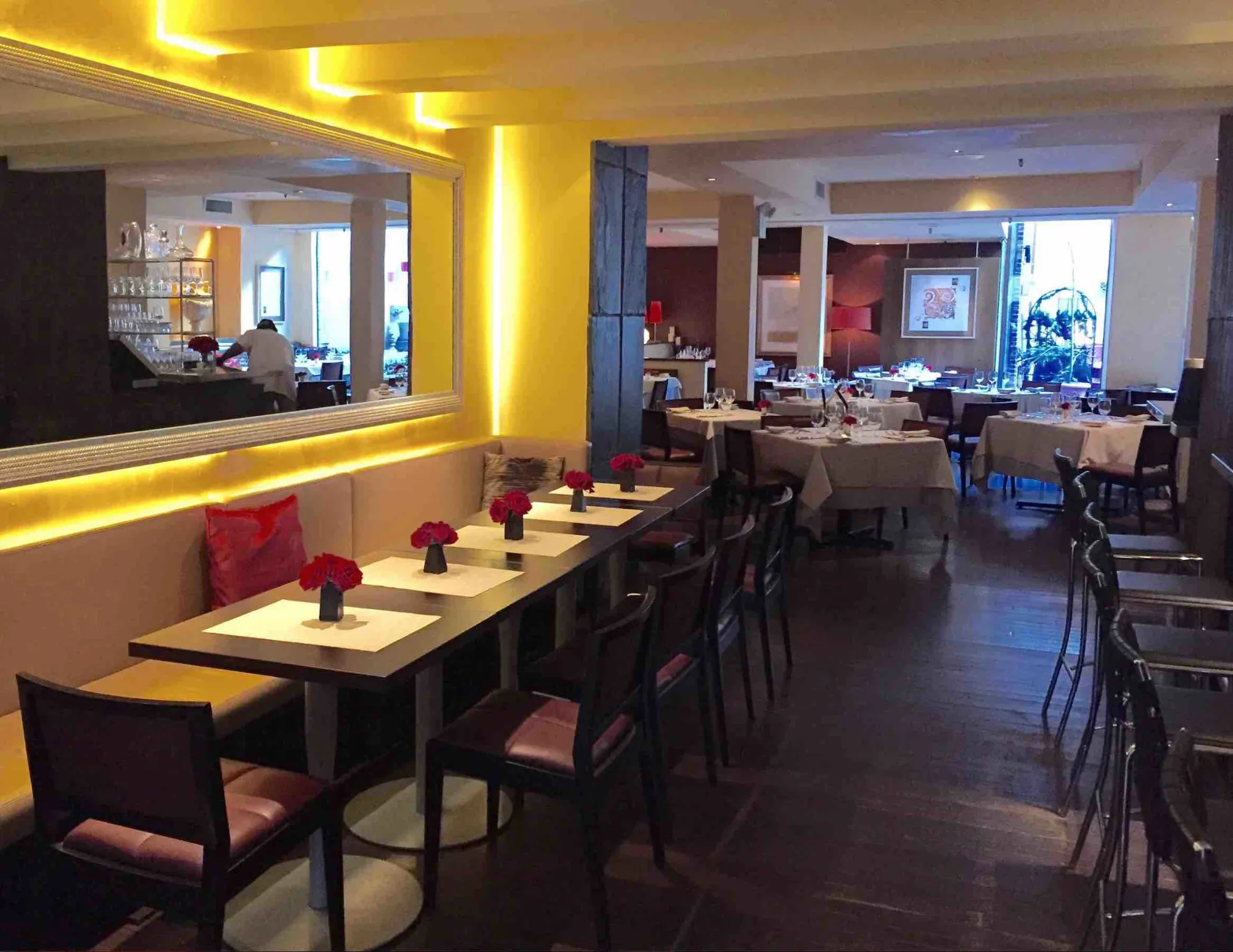 ViceVersa is a vibrant Theatre District staple. Here, you will find a delightful back patio and a sleek interior with top notch cuisine. Clean lines and white tablecloths make this an elegant spot for a pre-theater dinner. Natural tones fill the space and accents of red make give a pop of color. Chef Stefano Terzi makes all of his pastas from scratch and values each individual ingredient.